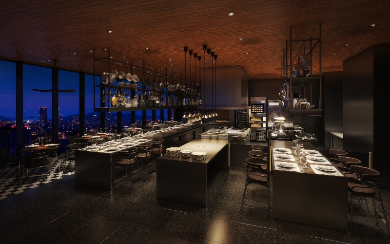 最上階のレストランは、メインダイニングの「THE KITCHEN」と、地元九州産をはじめとする厳選食材を目の前で華麗に焼き上げる鉄板焼きの「WAN STEAK HOUSE」が営業しています。「THE KITCHEN」はイタリアンメニューが中心の、まるで厨房の中で食事をしているような臨場感を味わえるレストランで、オープンキッチンを客席でぐるりと囲んだ、ドライブ感のある空間になっています。モーニング、ランチ、ディナーと、お好みの時間帯でどなたでも利用できます。同フロアの博多湾を望むカフェ&サンセットバー「THE ROOF」では、サンセットや夜景を楽しみながらカフェタイムを過ごせます。